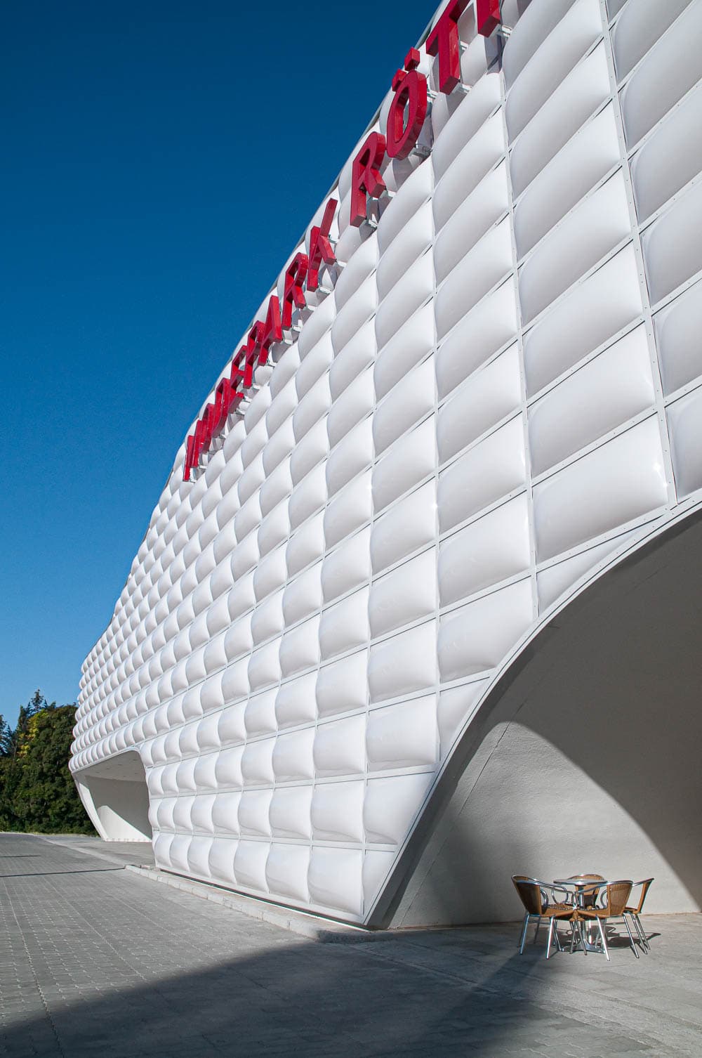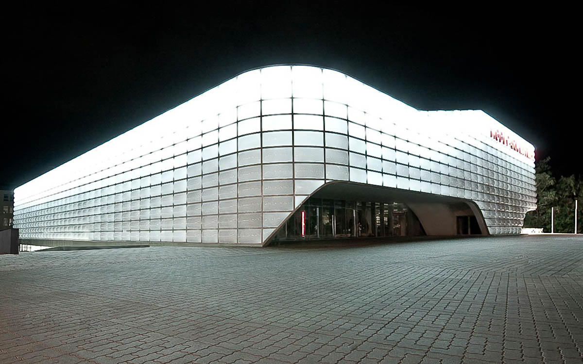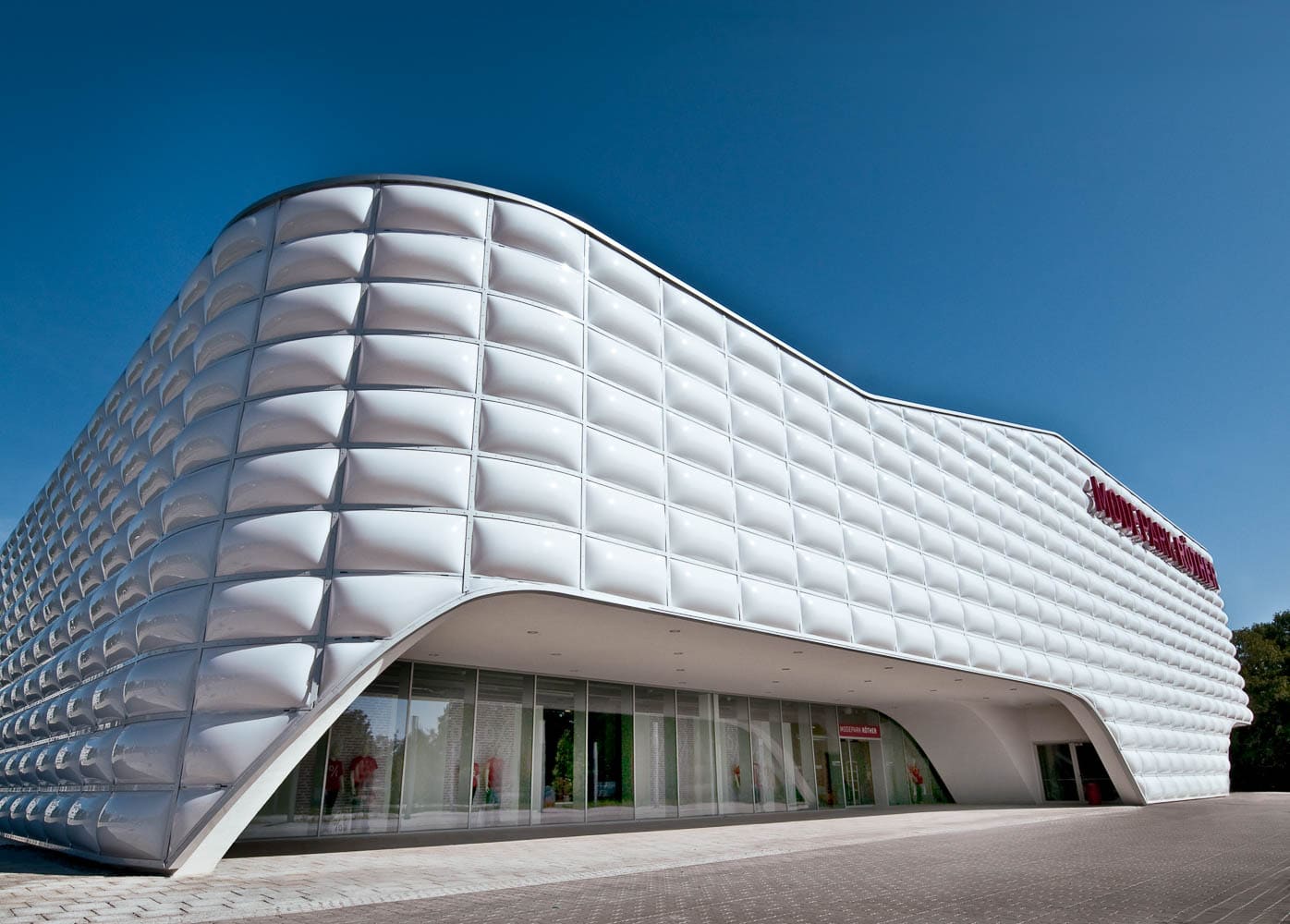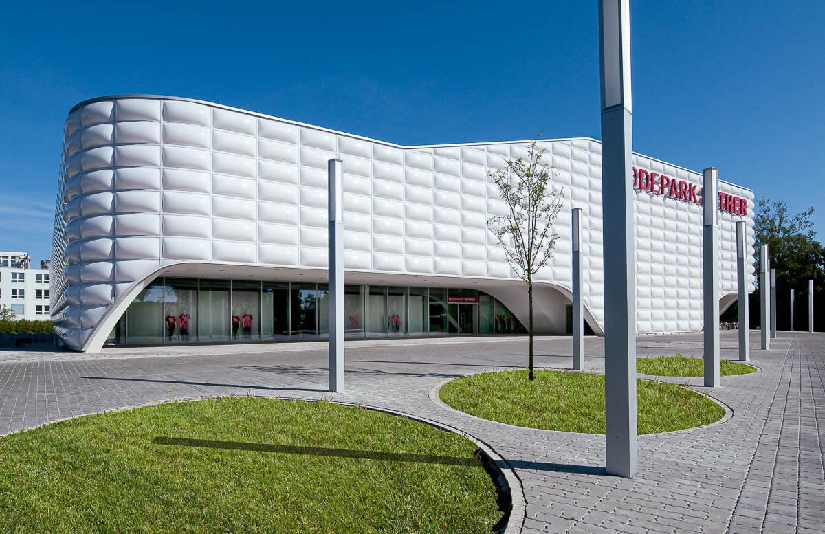 Das standardisierte Modehaus zeigt sich dank seines Plissees an der Fassade optisch anspruchsvoll. Besonders reizvoll und spannend wirkt die hinterleuchtete Fassade bei Nacht.